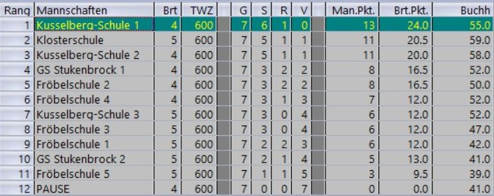 Am Ende stand der Gewinner fest: Mit 13 Mannschaftspunkten gewinnt die Kusselbergschule 1 mit 2 Mannschaftspunkten Vorsprung das Turnier. Auf Platz 2 behauptet sich die Klosterschule mit einem halben Brettpunkt mehr gegen die Kusselbergschule 2 auf Rang 3.